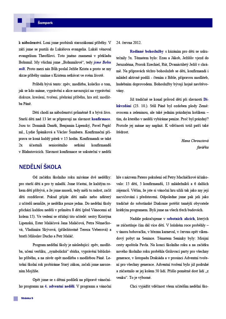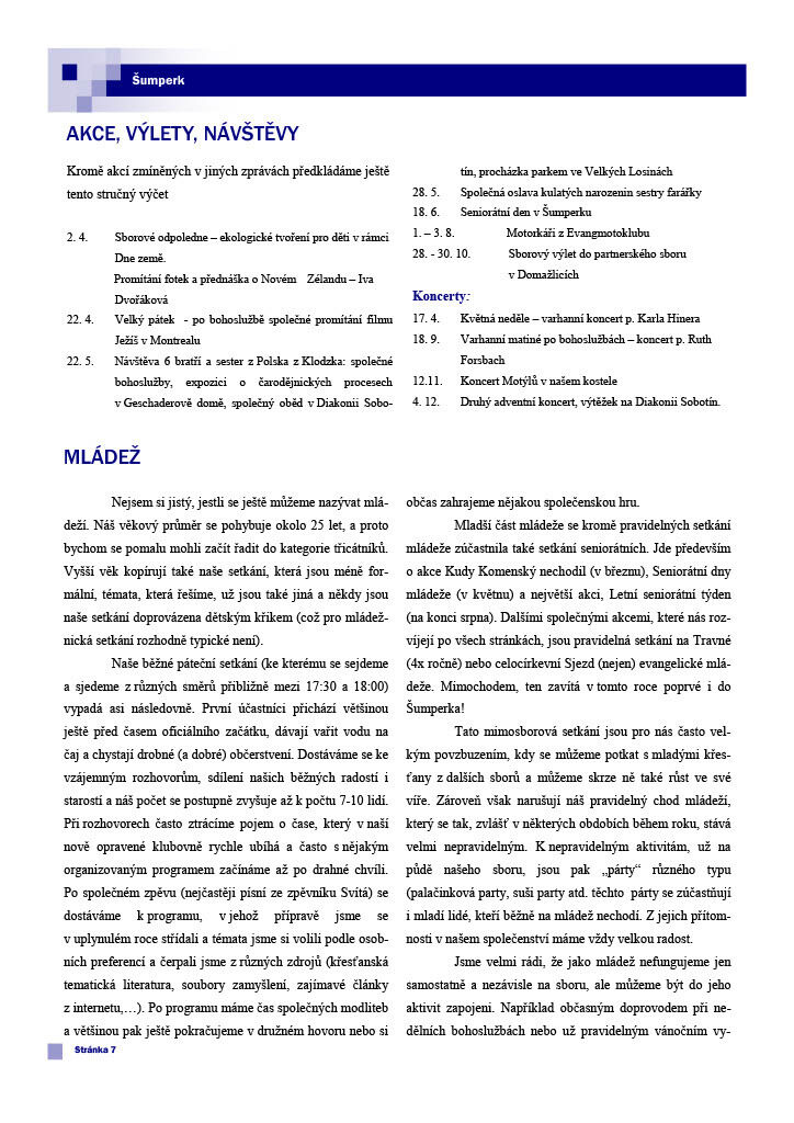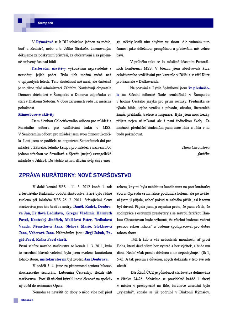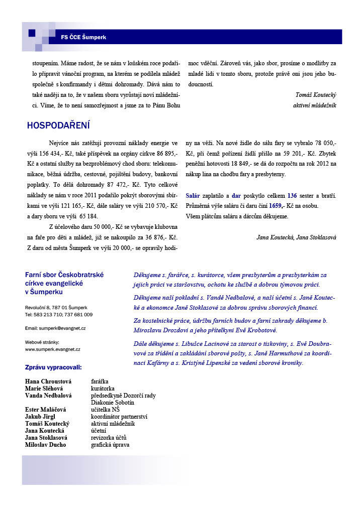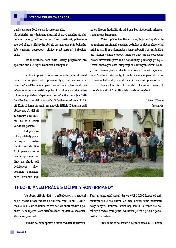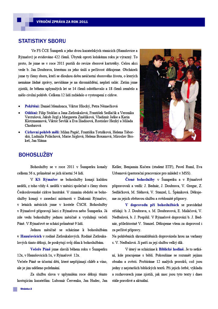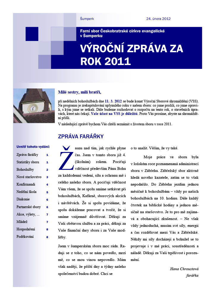 Před výročním sborovým shromážděním, které se bude konat 11. 3. 2012, vám dáváme k dispozici výroční zprávu. Je v ní mnoho užitečných a zajímavých informací o fungování sboru. Obsahuje například přehled statistik, zprávu kurátorky o fungování nového staršovstva, informace o generačních skupinách (nedělka, konfirmandi, mládež), daších setkáních (biblické hodiny, bohoslužby) a jiných aktivitách (partnerství se sborem v Maarssenu, návštěvy Diakonie, ...). Přejeme příjemné čtení.